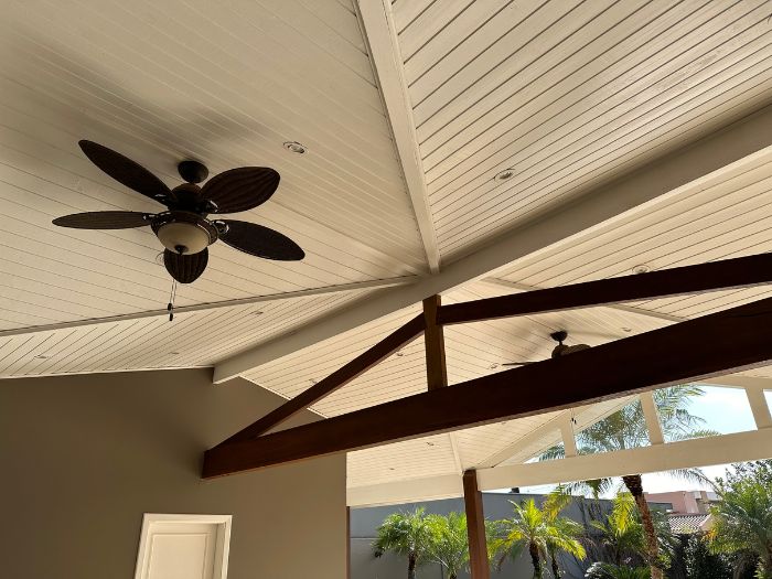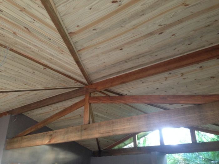 Forro composto inteiramente de pinus tratado, conferindo durabilidade, beleza natural e acabamento de alta qualidade.