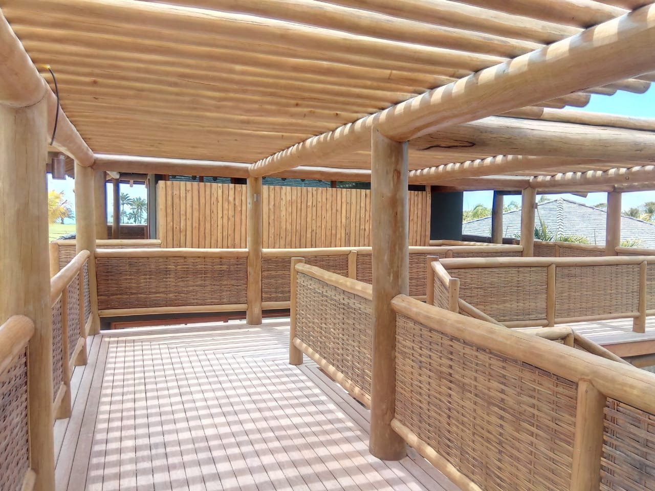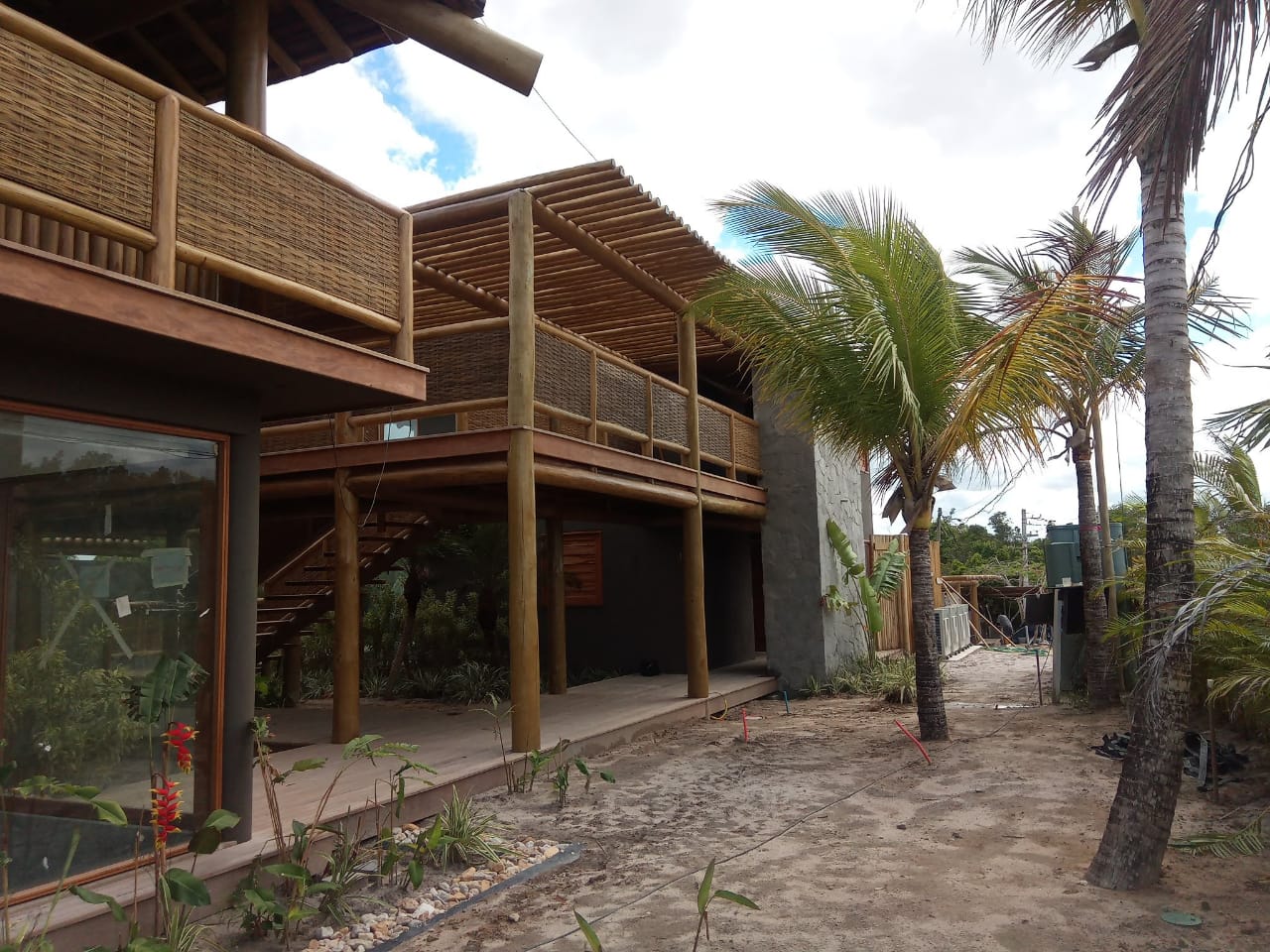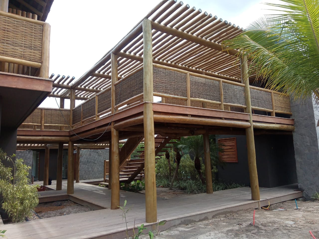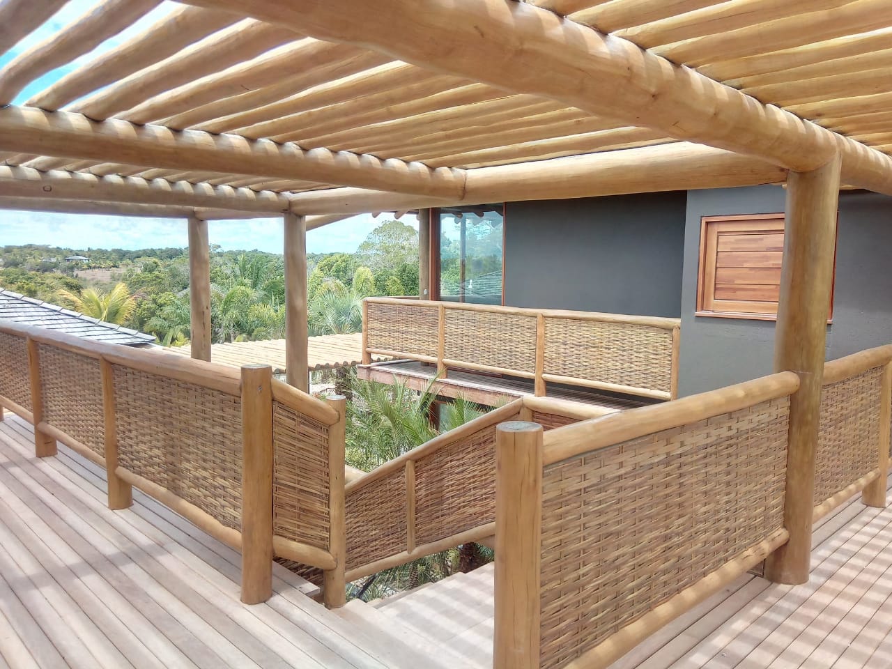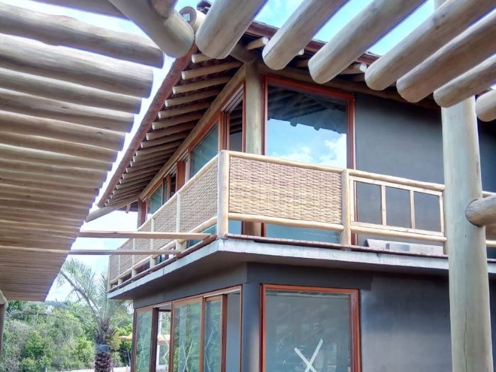 Belíssima casa de praia em Trancoso que destaca a beleza natural do eucalipto citriodora roliço. Este material foi escolhido para a estrutura de vigas, pilares e caibros, bem como para a cobertura de corredores e varandas, além de compor o guarda-corpo das varandas e o corrimão da escada. Para complementar o ambiente natural e harmonioso, os decks foram construídos com pinus tratado, conferindo durabilidade e charme rústico.
