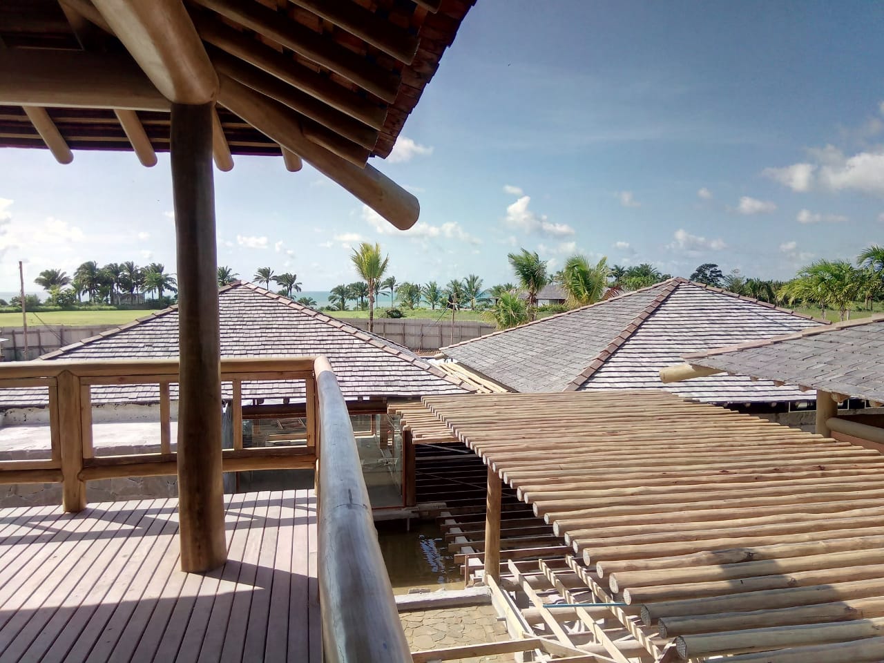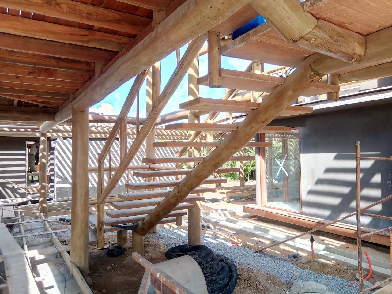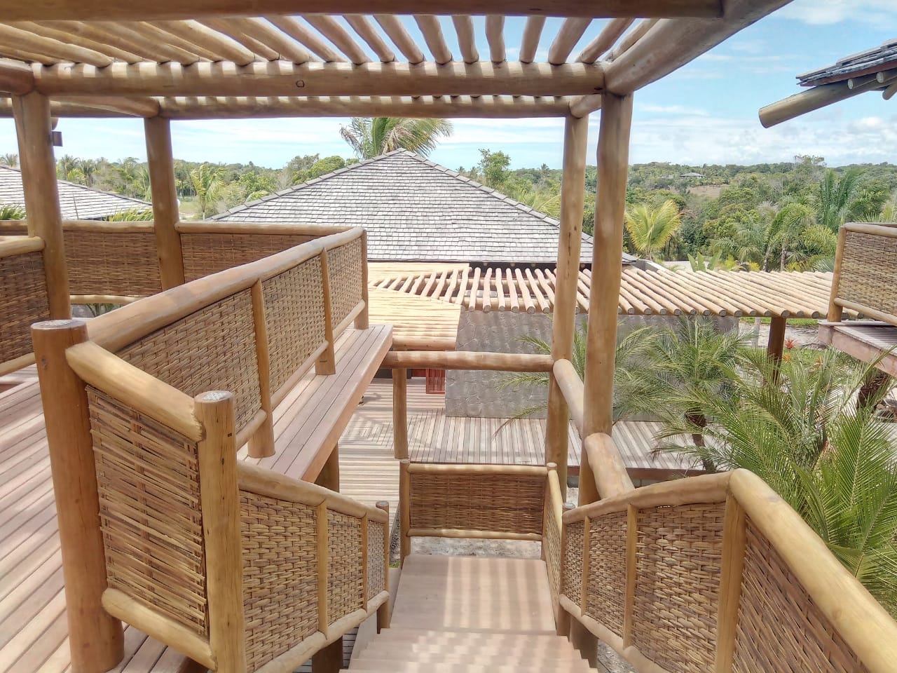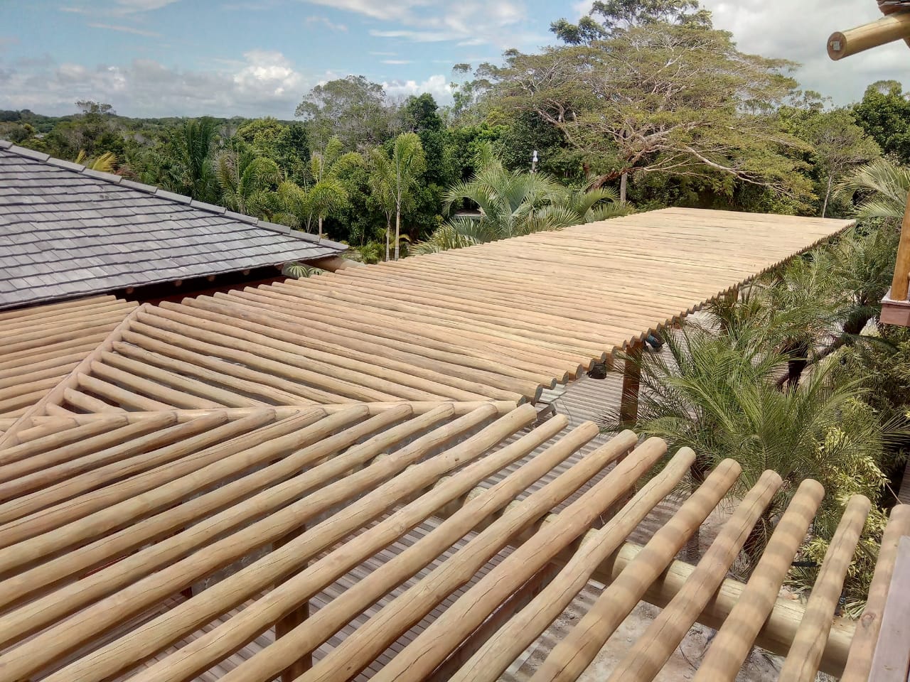 Belíssima casa de praia em Trancoso que destaca a beleza natural do eucalipto citriodora roliço. Este material foi escolhido para a estrutura de vigas, pilares e caibros, bem como para a cobertura de corredores e varandas, além de compor o guarda-corpo das varandas e o corrimão da escada. Para complementar o ambiente natural e harmonioso, os decks foram construídos com pinus tratado, conferindo durabilidade e charme rústico.