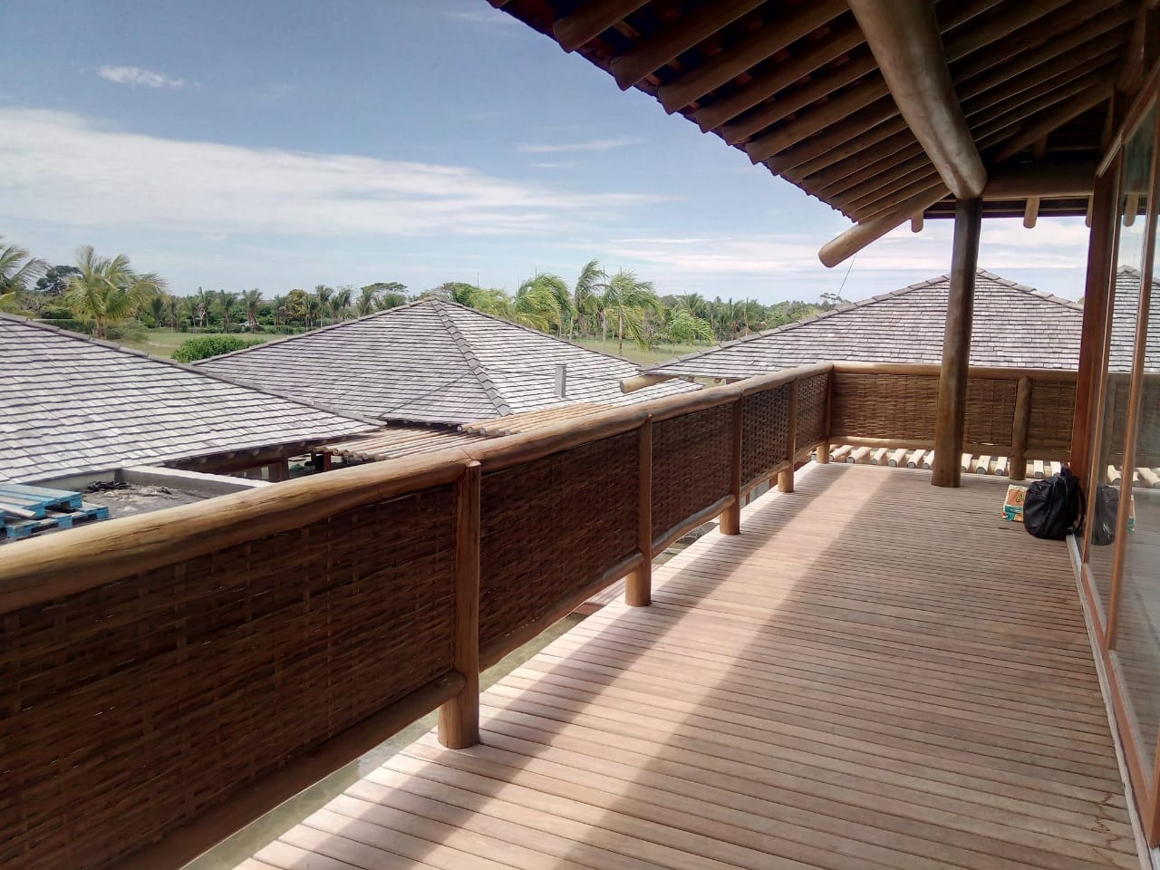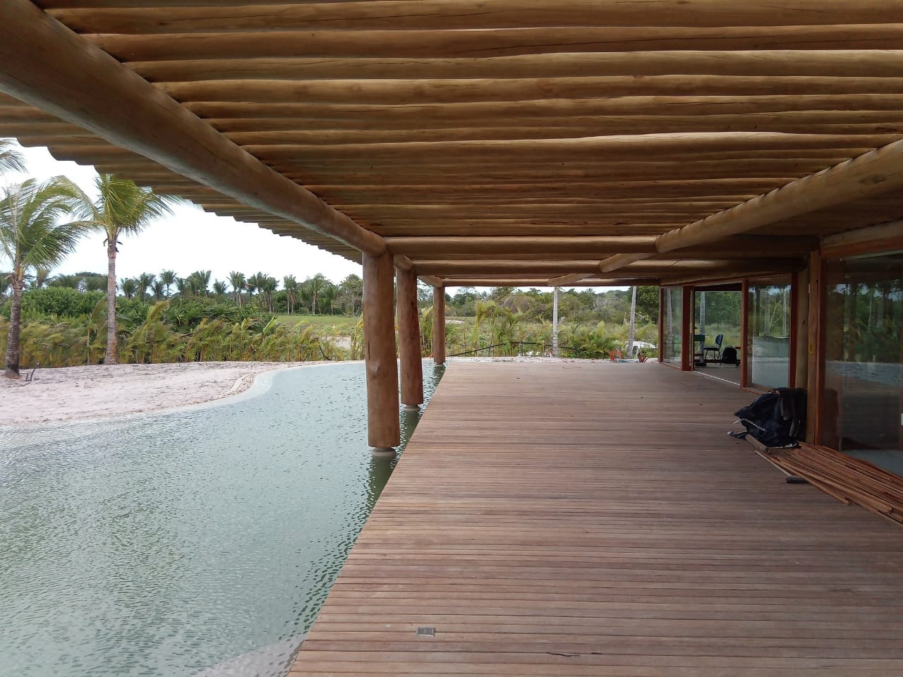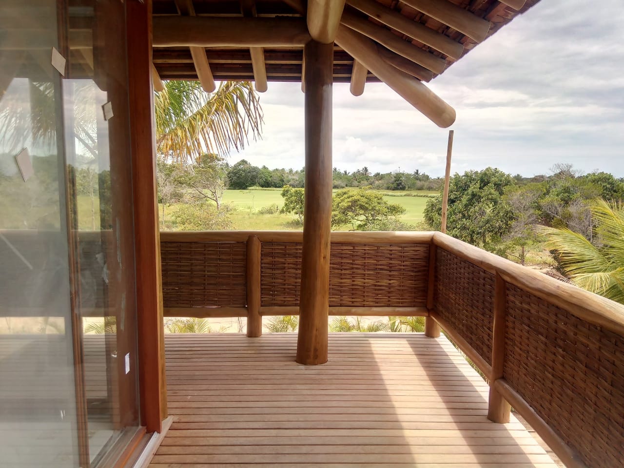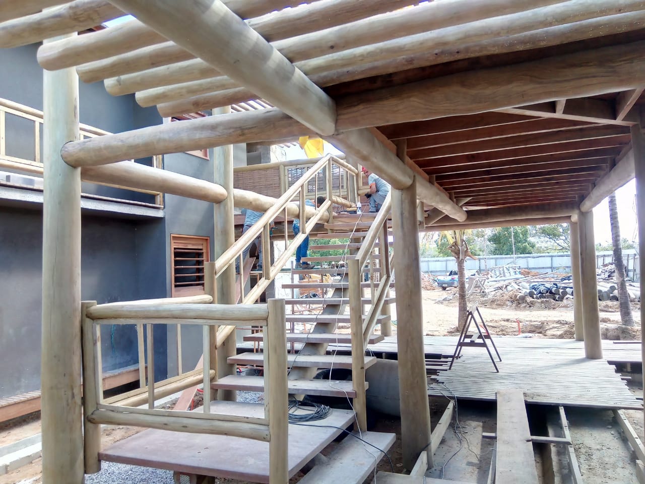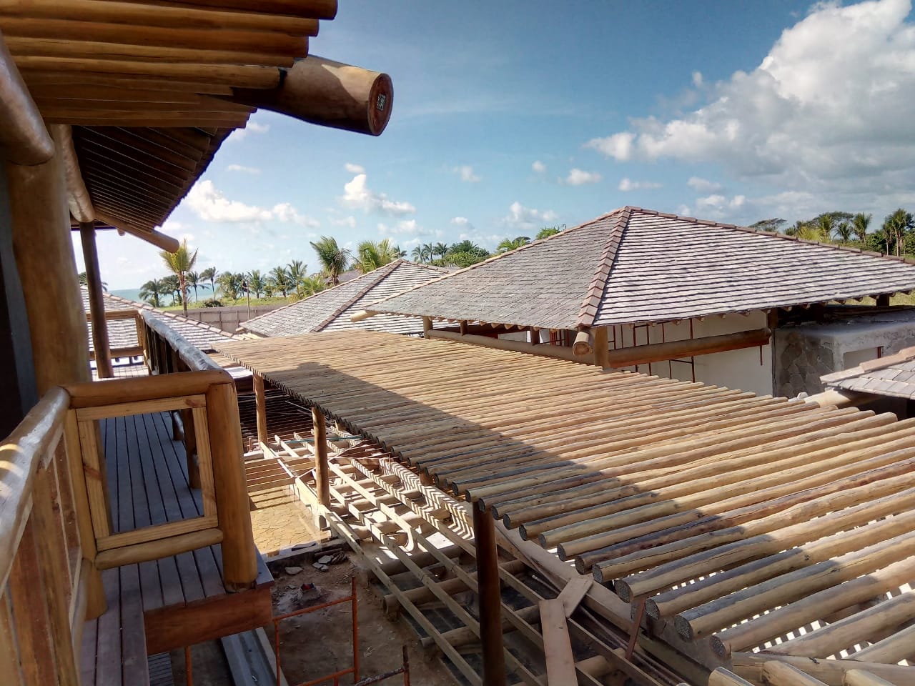 Belíssima casa de praia em Trancoso que destaca a beleza natural do eucalipto citriodora roliço. Este material foi escolhido para a estrutura de vigas, pilares e caibros, bem como para a cobertura de corredores e varandas, além de compor o guarda-corpo das varandas e o corrimão da escada. Para complementar o ambiente natural e harmonioso, os decks foram construídos com pinus tratado, conferindo durabilidade e charme rústico.