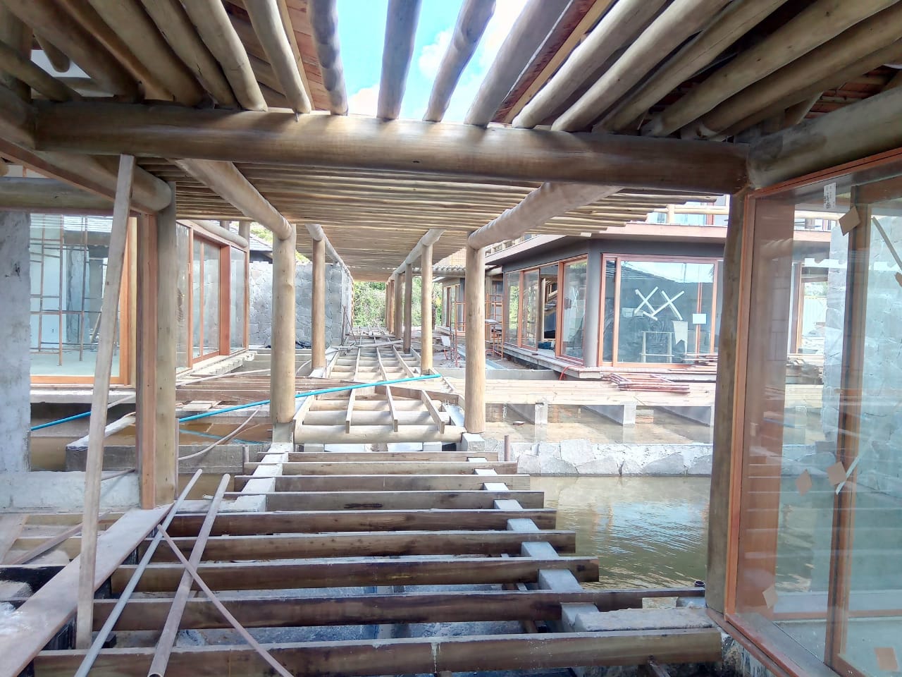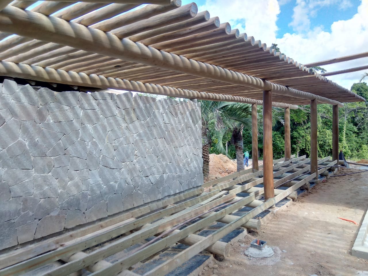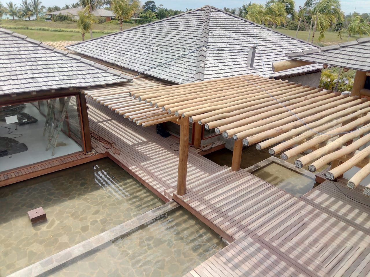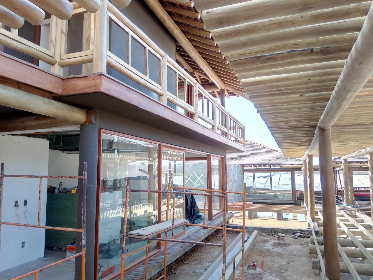 Belíssima casa de praia em Trancoso que destaca a beleza natural do eucalipto citriodora roliço. Este material foi escolhido para a estrutura de vigas, pilares e caibros, bem como para a cobertura de corredores e varandas, além de compor o guarda-corpo das varandas e o corrimão da escada. Para complementar o ambiente natural e harmonioso, os decks foram construídos com pinus tratado, conferindo durabilidade e charme rústico.