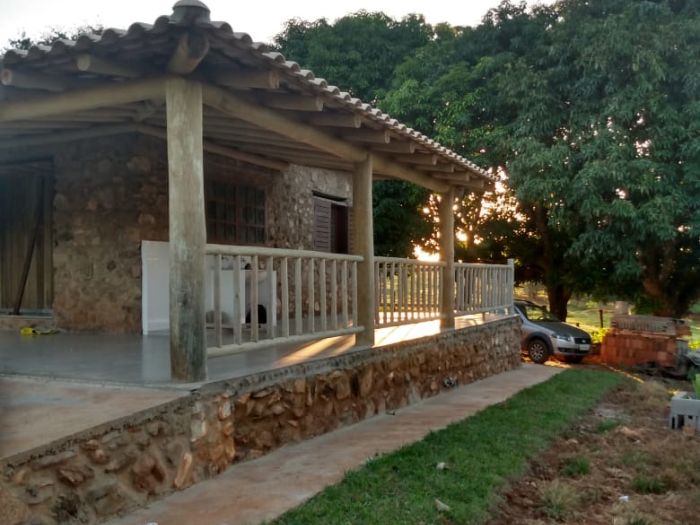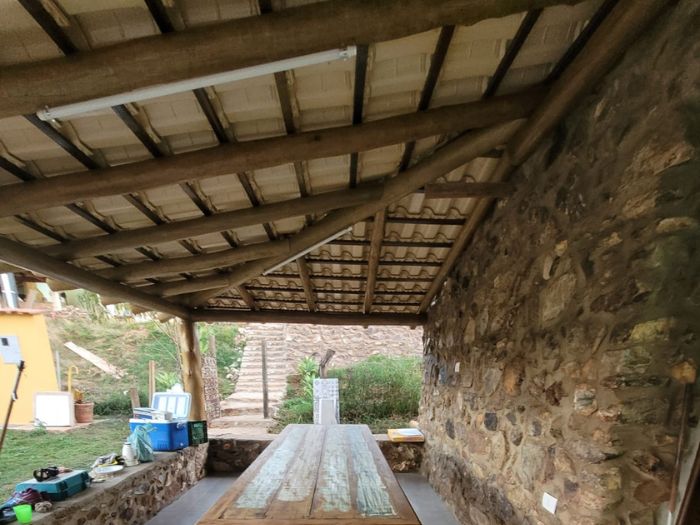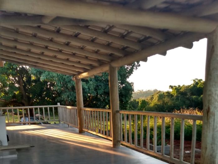 Na criação desta charmosa varanda, utilizamos eucalipto citriodora roliço tratado para a estrutura do telhado, pilares e guarda-corpo. A harmonia perfeita entre a madeira e as paredes de pedra proporciona um ambiente rústico e acolhedor.