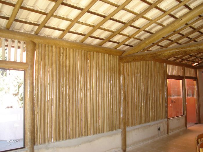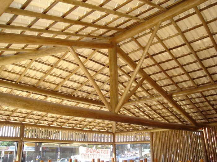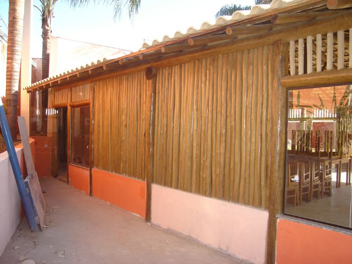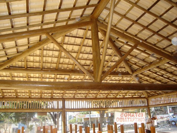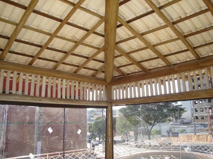 Descubra a magia desta pizzaria, onde o telhado em eucalipto tratado cria um ambiente acolhedor e sofisticado. Com um fechamento em vidro e peças de eucalipto roliço de baixo diâmetro, o salão oferece uma experiência visual única, destacando a beleza natural da madeira tratada.
