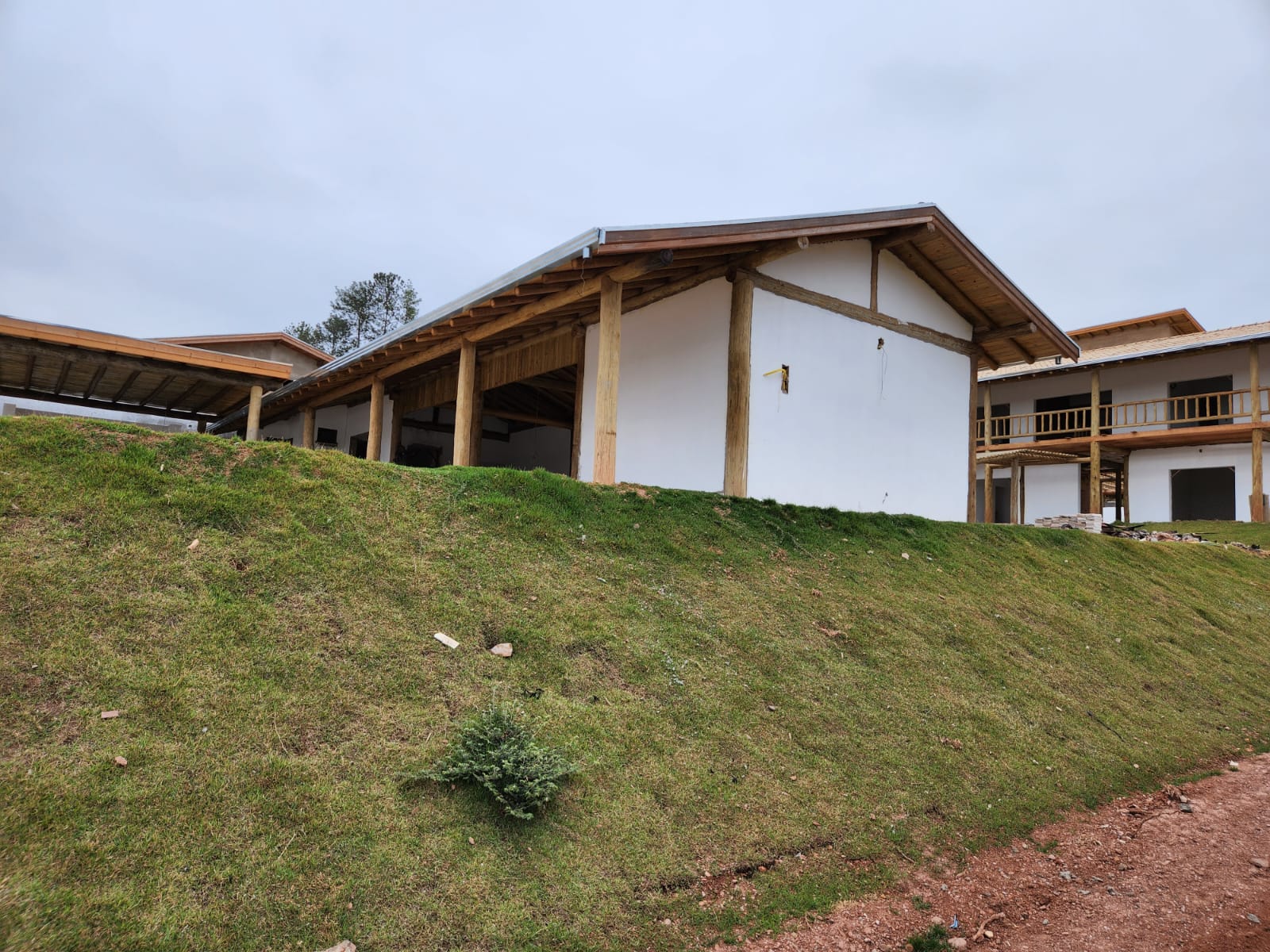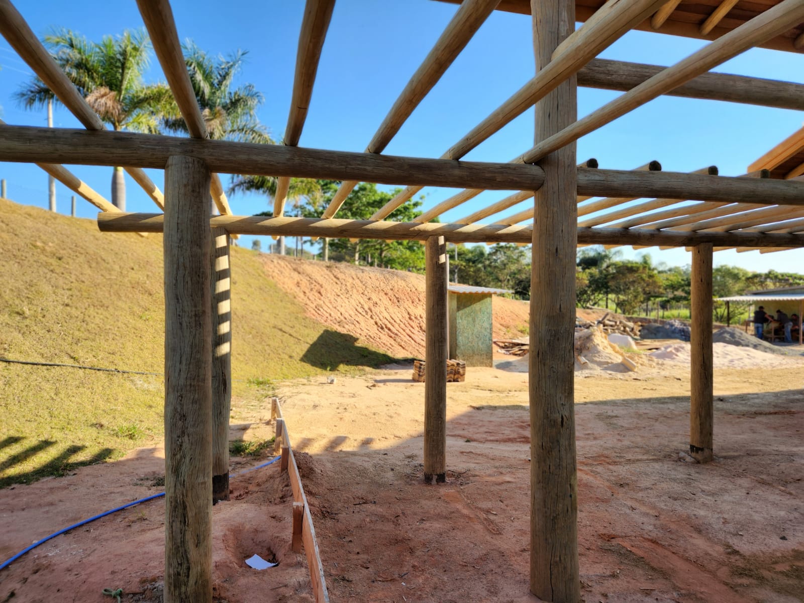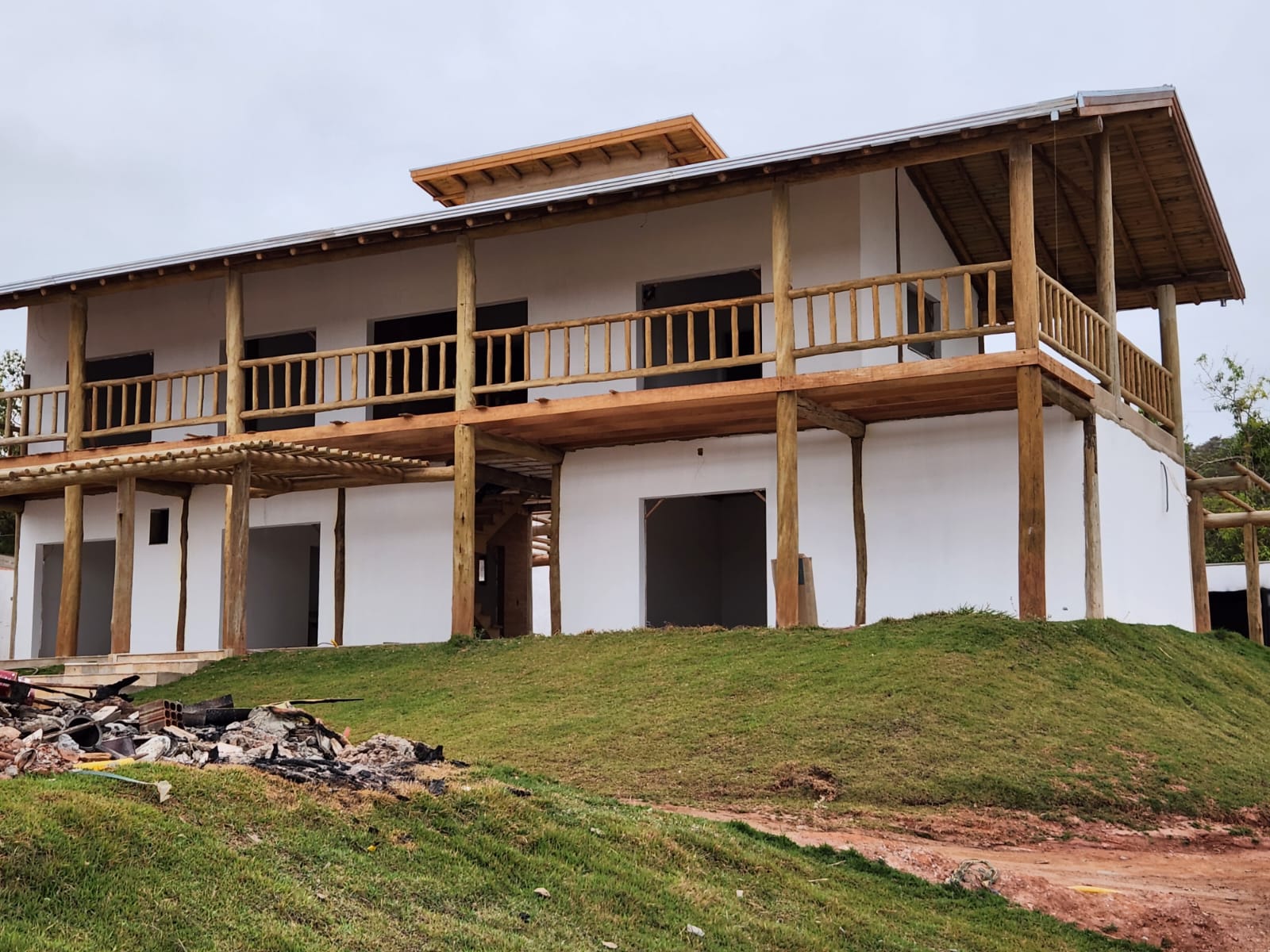 A estrutura da casa e o pergolado são construídos com robusto eucalipto roliço tratado, proporcionando durabilidade e beleza natural. O deck possui estrutura em eucalipto serrado tratado, enquanto a superfície do deck e o forro são em pinus tratado, garantindo um acabamento refinado e resistente às intempéries.