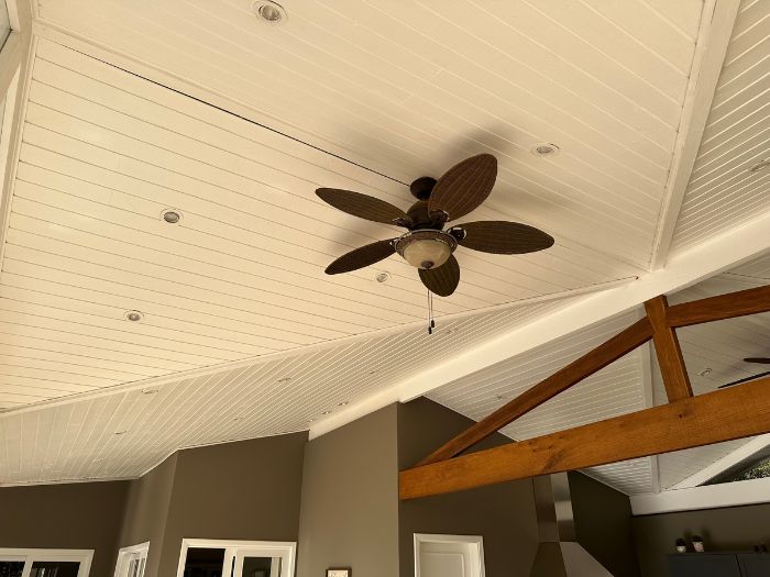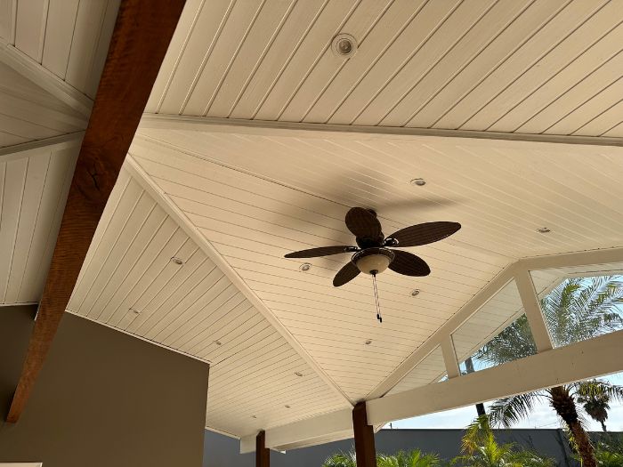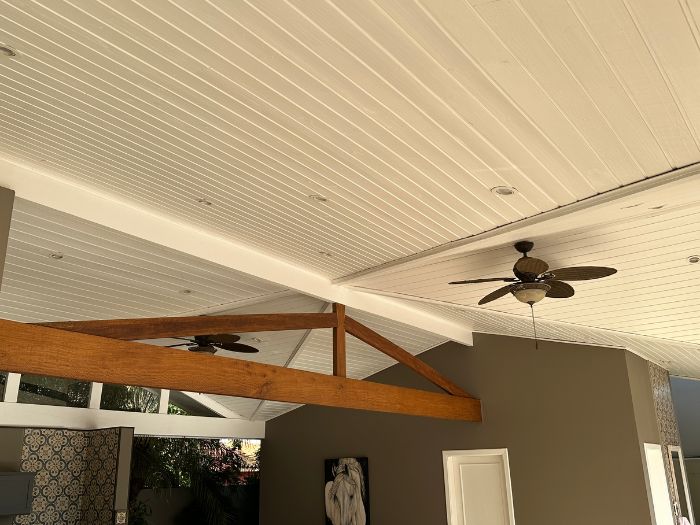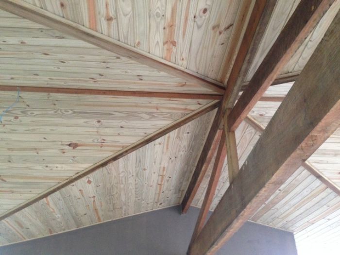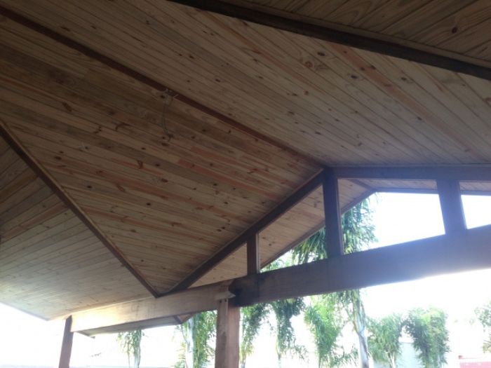Forro composto inteiramente de pinus tratado, conferindo durabilidade, beleza natural e acabamento de alta qualidade.