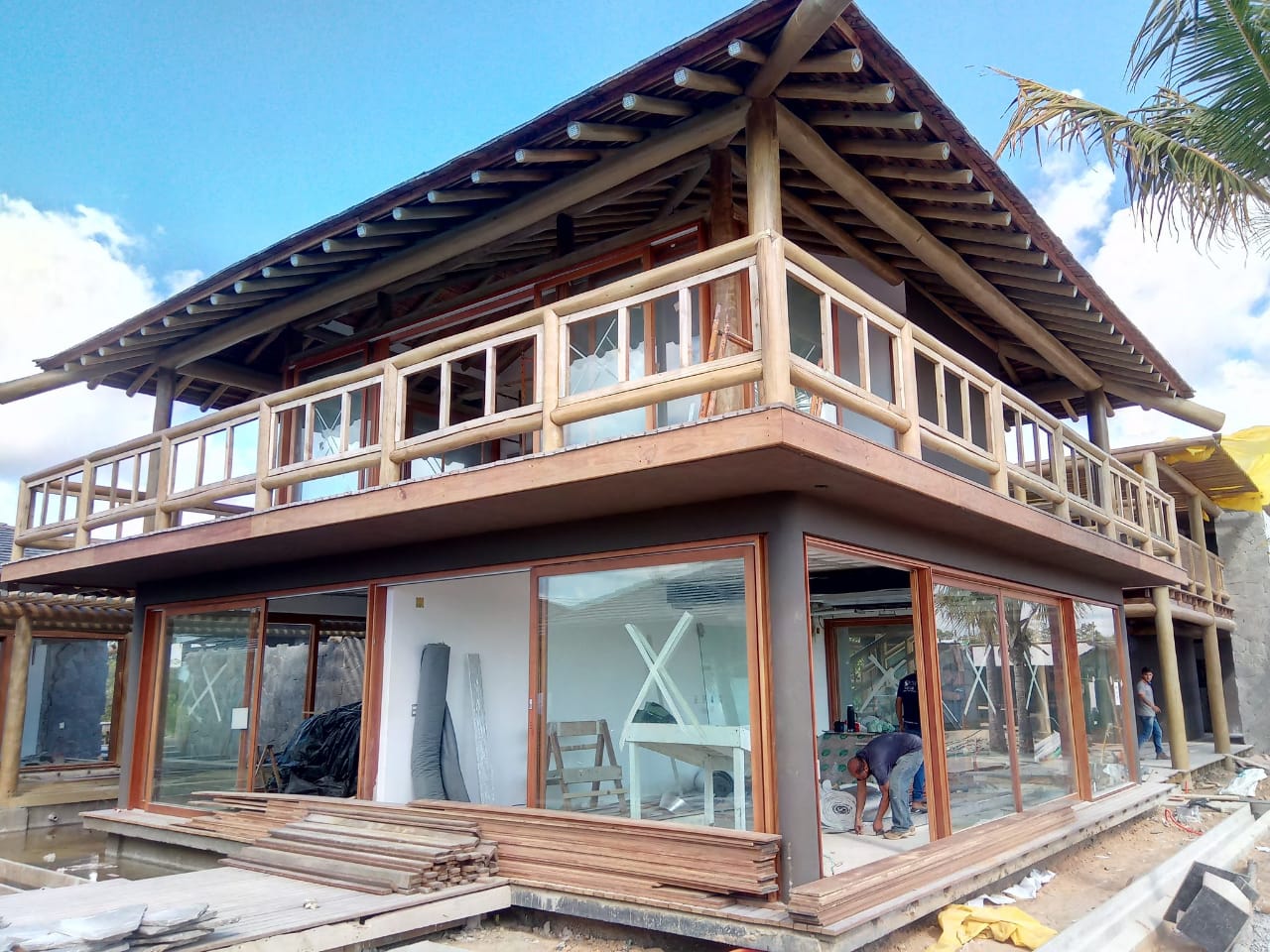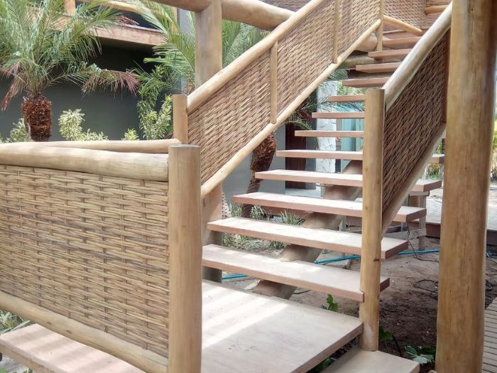 Belíssima casa de praia em Trancoso que destaca a beleza natural do eucalipto citriodora roliço. Este material foi escolhido para a estrutura de vigas, pilares e caibros, bem como para a cobertura de corredores e varandas, além de compor o guarda-corpo das varandas e o corrimão da escada. Para complementar o ambiente natural e harmonioso, os decks foram construídos com pinus tratado, conferindo durabilidade e charme rústico.