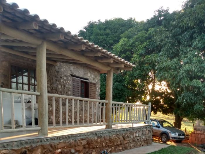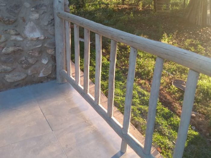 Na criação desta charmosa varanda, utilizamos eucalipto citriodora roliço tratado para a estrutura do telhado, pilares e guarda-corpo. A harmonia perfeita entre a madeira e as paredes de pedra proporciona um ambiente rústico e acolhedor.