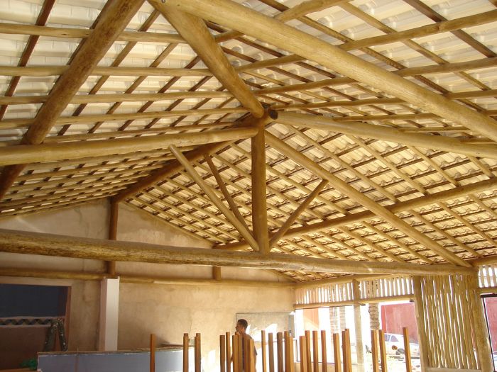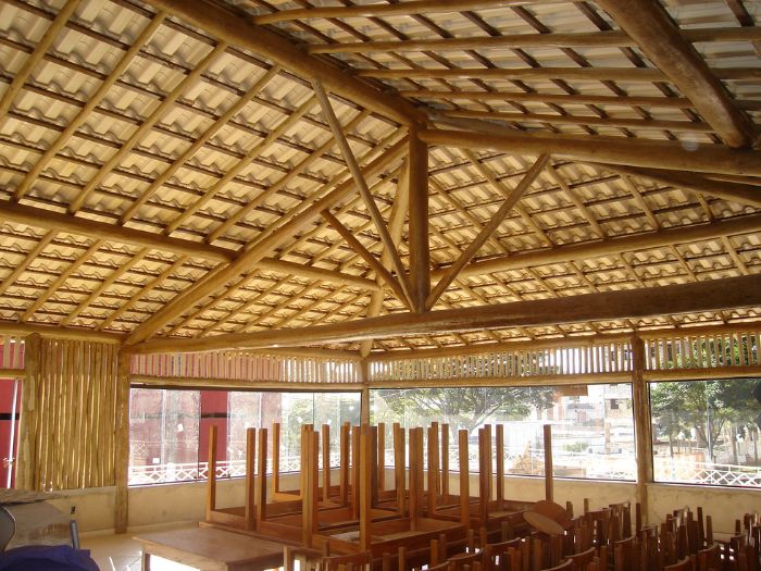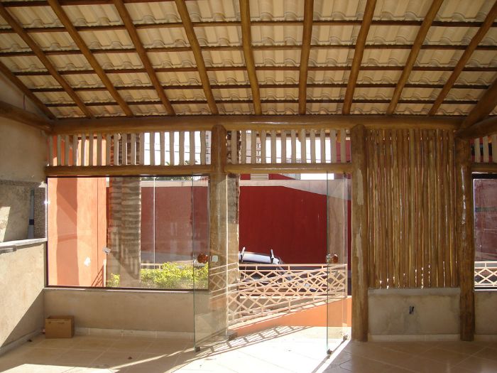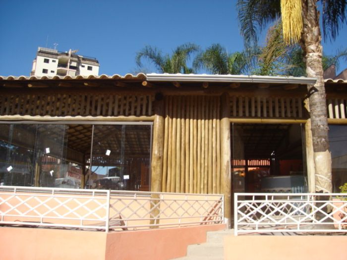 Descubra a magia desta pizzaria, onde o telhado em eucalipto tratado cria um ambiente acolhedor e sofisticado. Com um fechamento em vidro e peças de eucalipto roliço de baixo diâmetro, o salão oferece uma experiência visual única, destacando a beleza natural da madeira tratada.